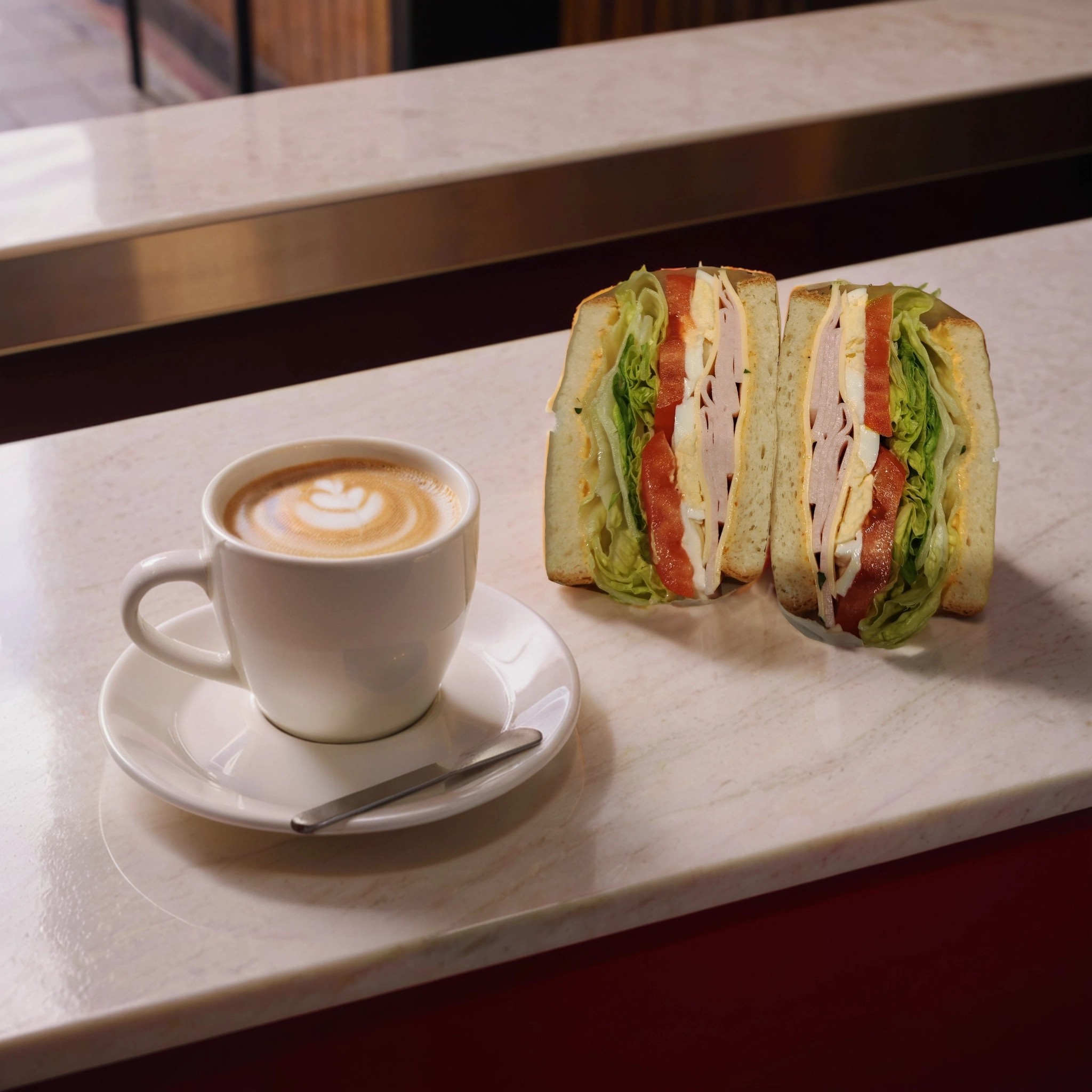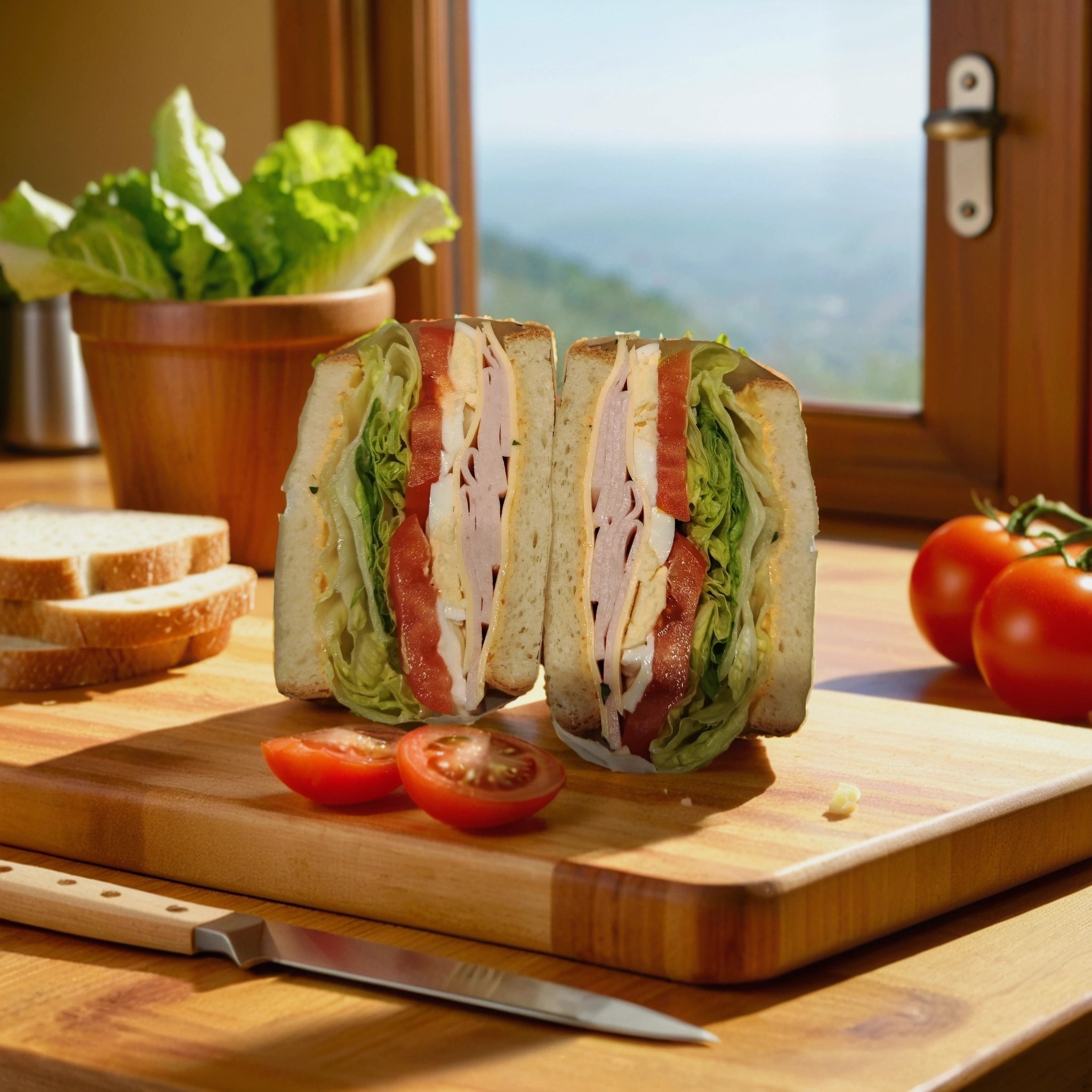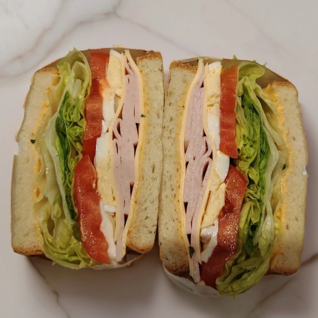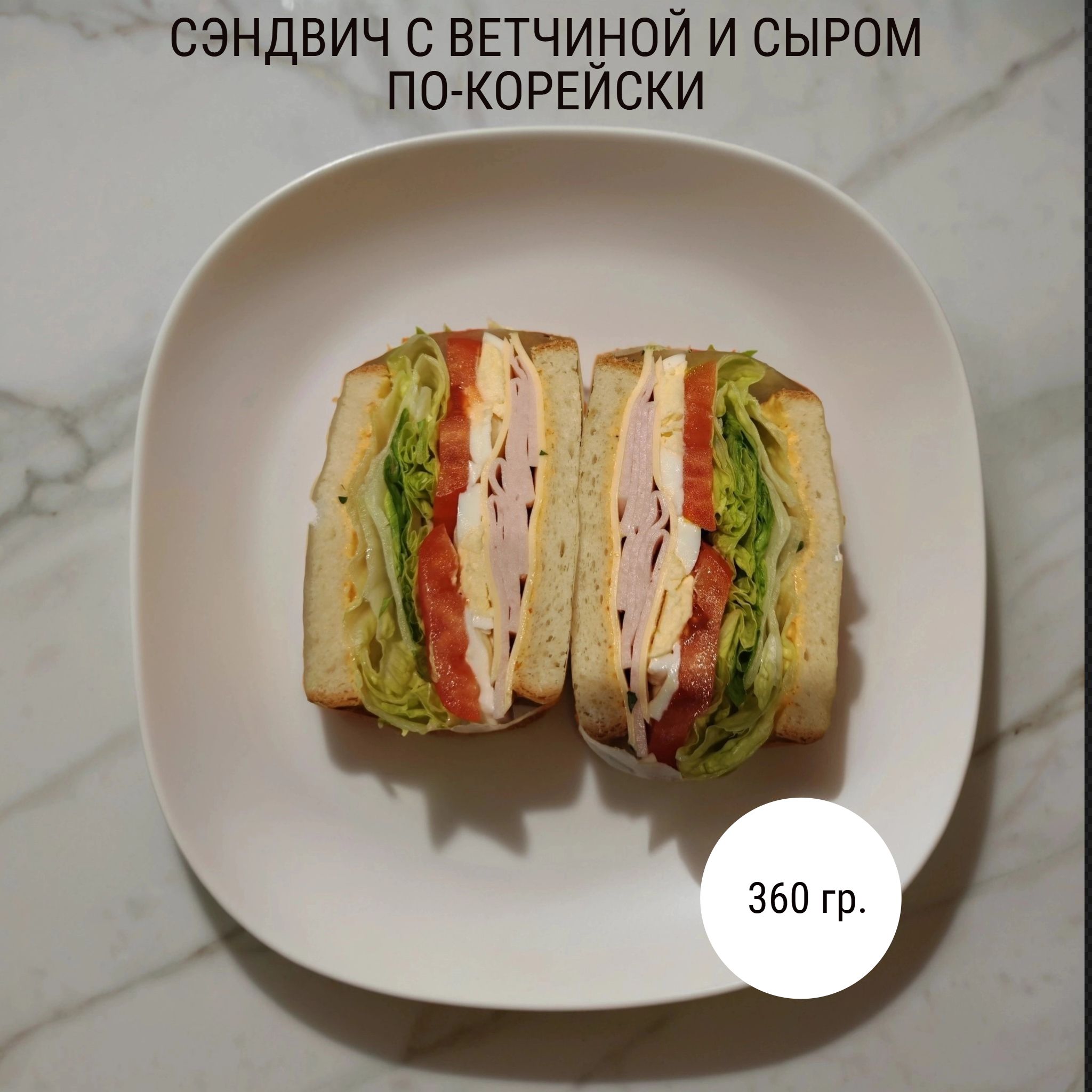 Наш сэндвич объединяет нежность хлеба и сливочность сыра со свежестью салата и сочностью помидоров. Ароматная ветчина из индейки, сочная начинка с яйцом и помидором, пикантные нотки пасты Кочудян, дижонской горчицы и кисло-сладкий акцент маринованных огурчиков — всё это превращает каждый укус в гастрономическое удовольствие!